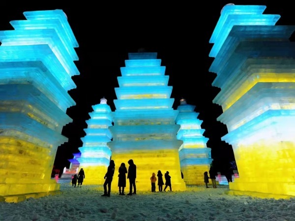 Magnificent illuminated ice and snow sculptures are set up in the million-square-meter Changchun Ice and Snow New World, as well as a whole host of entertainment facilities. [Photo provided to chinadaily.com.cn]