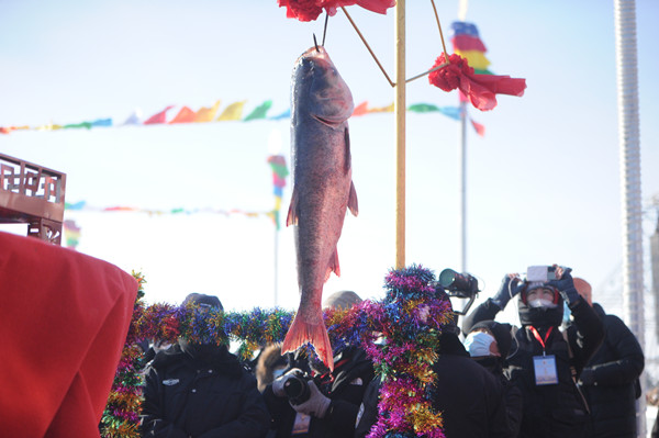 The first fish of this year's winter fishing season is sold for 2,999,999 yuan ($470,999.84) during an auction. [Photo provided to gojilin.gov.cn]