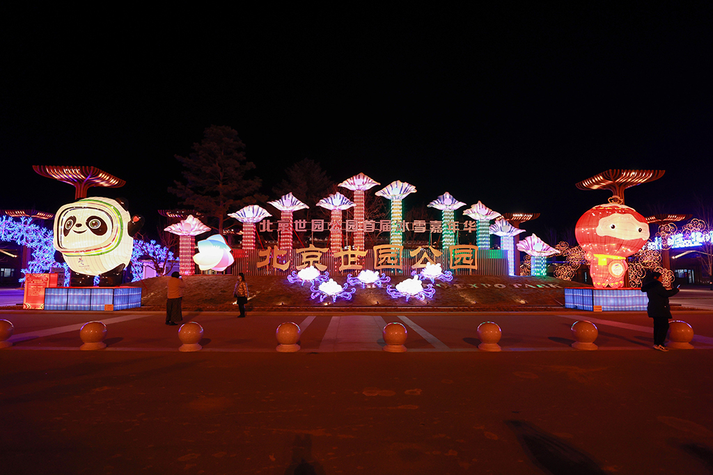 The entrance of the Beijing Expo Park is lit up by lantern installations of the mascots of the 2022 Beijing Winter Olympic Games. [Photo/IC]