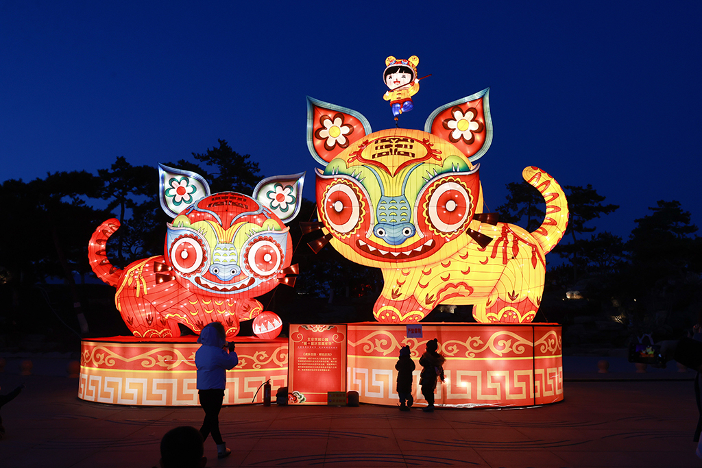 Visitors snap photos of tiger-themed lantern installations in Beijing Expo Park. [Photo/IC]