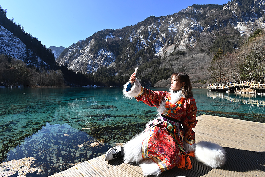 A woman takes a selfie amid the picturesque winter scenery of the Jiuzhai Valley in Southwest China’s Sichuan province. [Photo/IC]