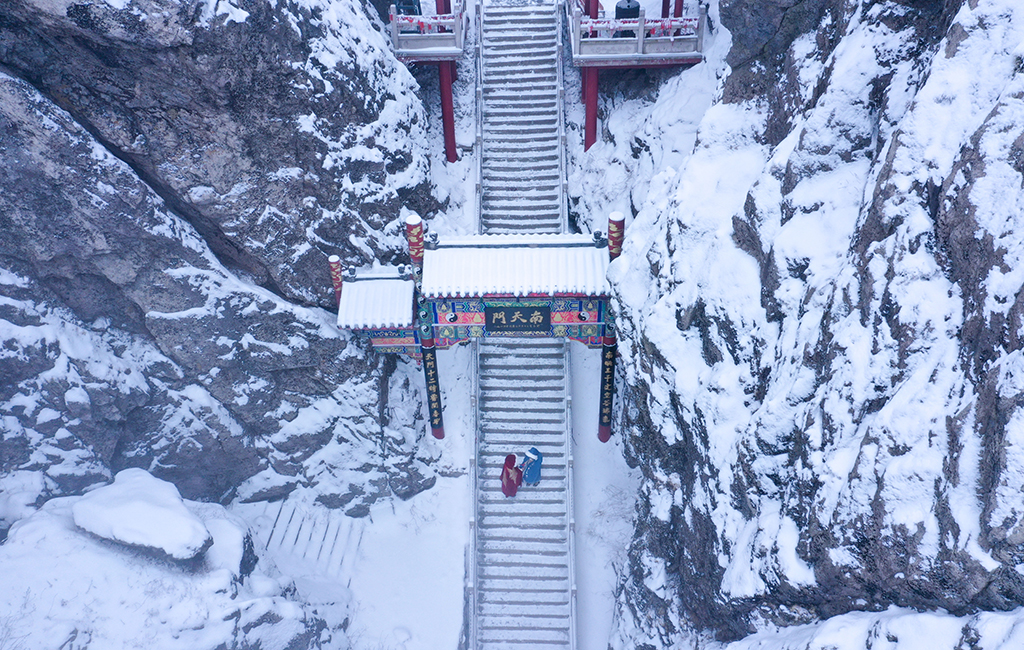 Mount Laojun in Luoyang, Central China’s Henan province recently welcomed the first snow of 2022. The gilded roof pavilion on the mountain top is covered in snow, looking like an immortal's land and inspiring women wearing chiffon gowns to dance.