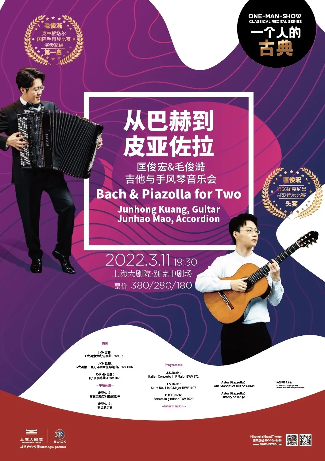 Young accordionist Mao Junhao and guitarist Kuang Junhong will perform at a recital at the Shanghai Grand Theater on March 11, featuring their adaptations of works by Johann Sebastian Bach and Piazzolla. Can’t wait to enjoy an evening of enchanting classical music.