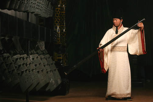 A performer stands by the replica Chime Bells of Wangsun Gao, which were unearthed at the Chu Tomb, Xiasi, Xichuan, Central China’s Henan province during the Spring and Autumn Period (770-476 BC). [Photo/Website of Henan Museum]