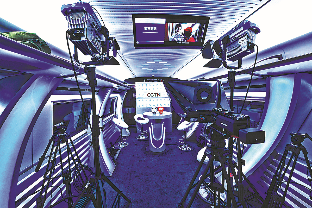 A studio for high definition live broadcasts on a Fuxing bullet train specially designed for the 2022 Winter Olympics. [Photo by SUN LIJUN/FOR CHINA DAILY]