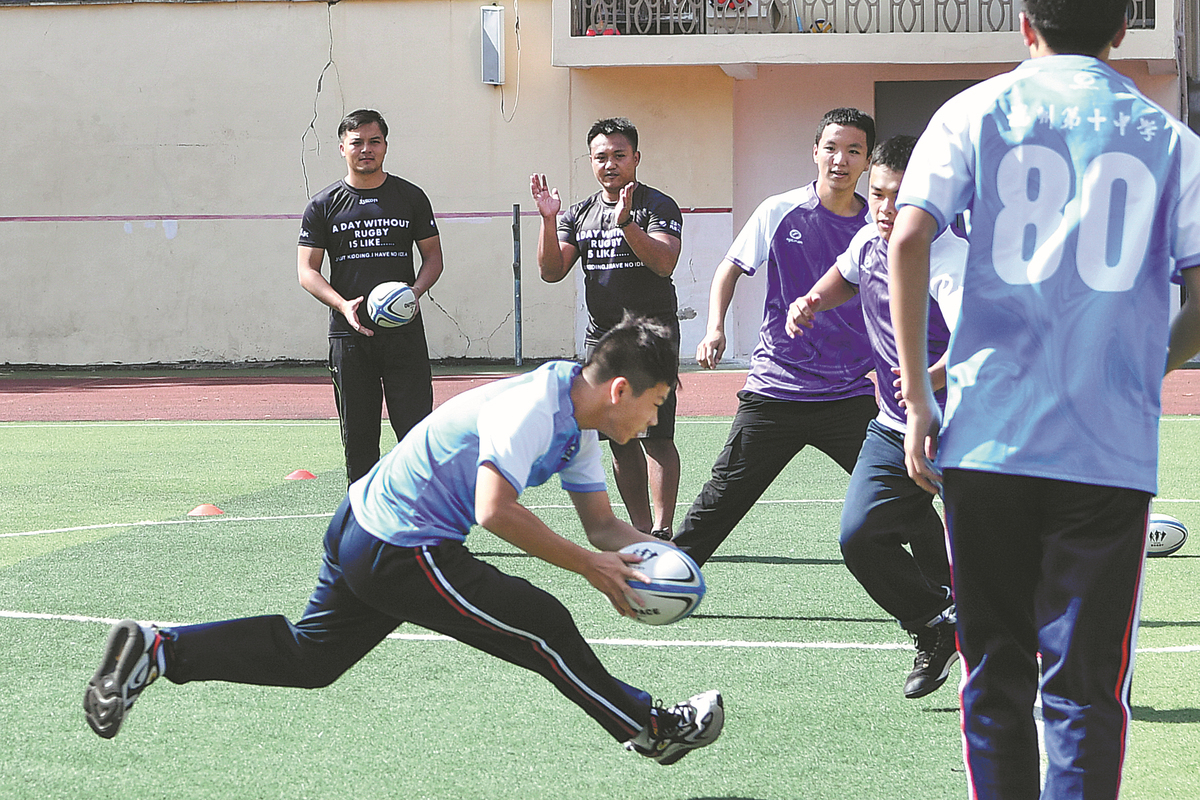Yeh Chao-hsiang (fourth from right) encourages students from the No 10 Middle School of Fuzhou during a rugby training session in Fuzhou, Fujian province. [Photo provided to China Daily]