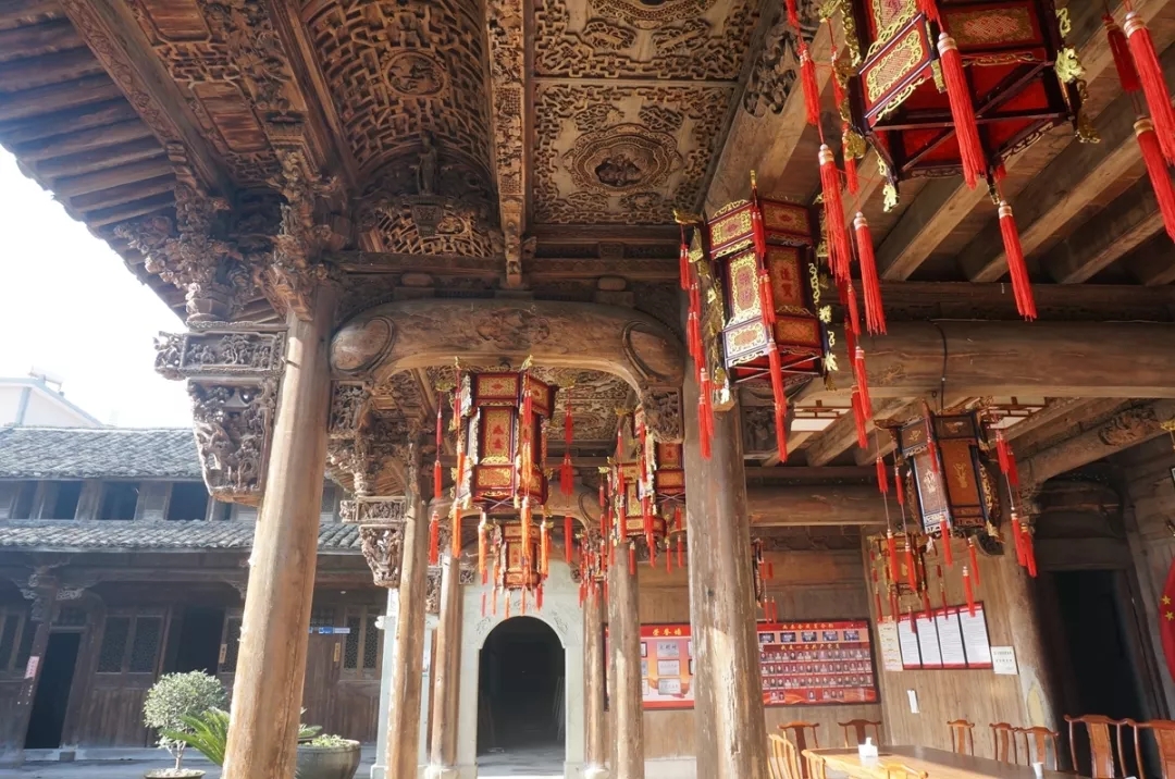 Similar to stage caissons, architectural carvings of Shijiazhuang Flower Hall in Dongyang county, Jinhua, Zhejiang province also displays complicated, delicate, slender and gorgeous crafts of the late Qing Dynasty.