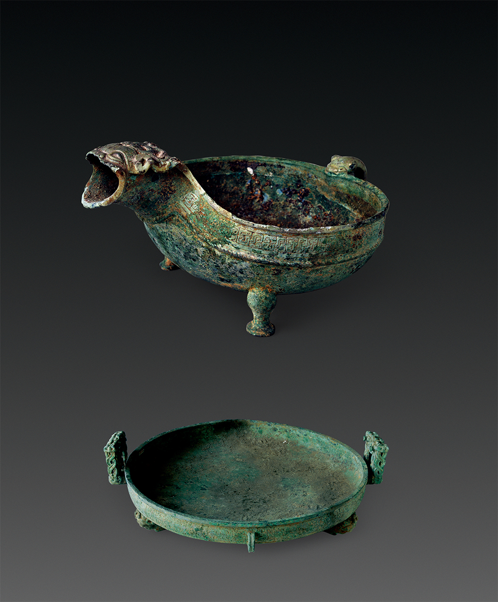 yi ewer with a beast head (upper) and a bronze plate were used in the rites of washing. Spring and Autumn Period (770-476 BC), unearthed in Yueyang, Hunan province, a permanent collections of the Yueyang Museum [Photo/Official website of Hunan Museum]
