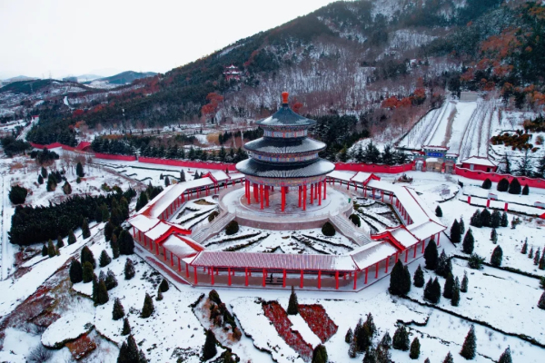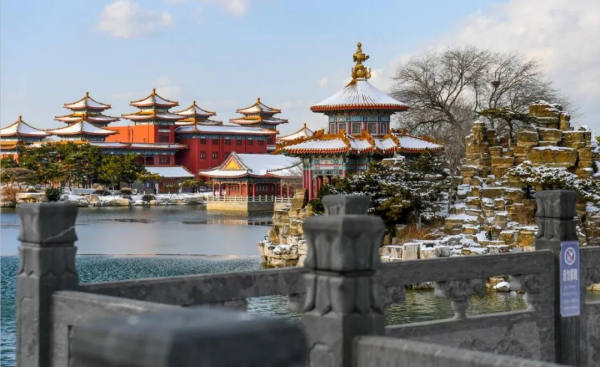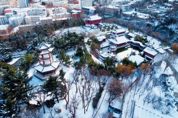 Antique pavilions and corridors at Yuhuangding Park are sprinkled with snowflakes. [Photo/WeChat account: yantaifabu]