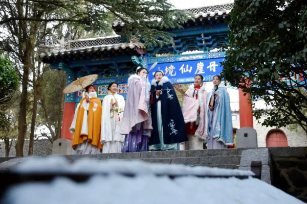 Women wearing hanfu pose for a photo with snow in the forefront as their prop at Penglai Pavilion, a popular attraction in Yantai. [Photo/WeChat account: yantaifabu]