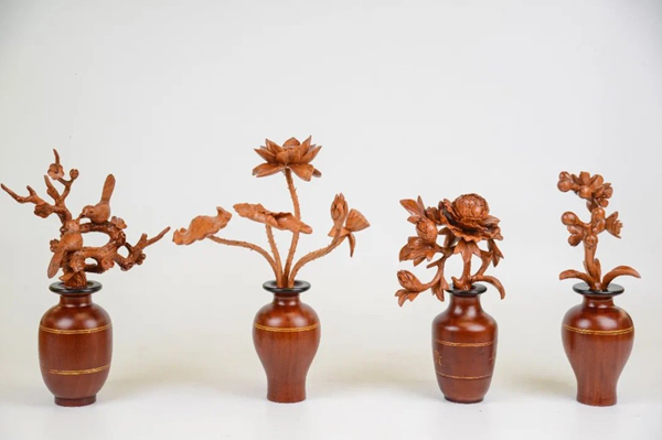 Four exquisite mahogany vases consist of carved mahogany flowers. The craft was listed as one of Shandong's intangible cultural heritage items in 2007. [Photo/provided to chinadaliy.com.cn]