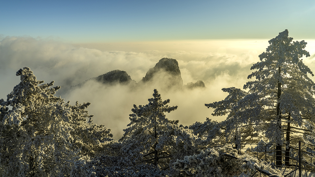 The magnificent vista of cotton-looking clouds hovering over the snow-capped Mount Huangshan in East China’s Anhui province. [Photo/IC]