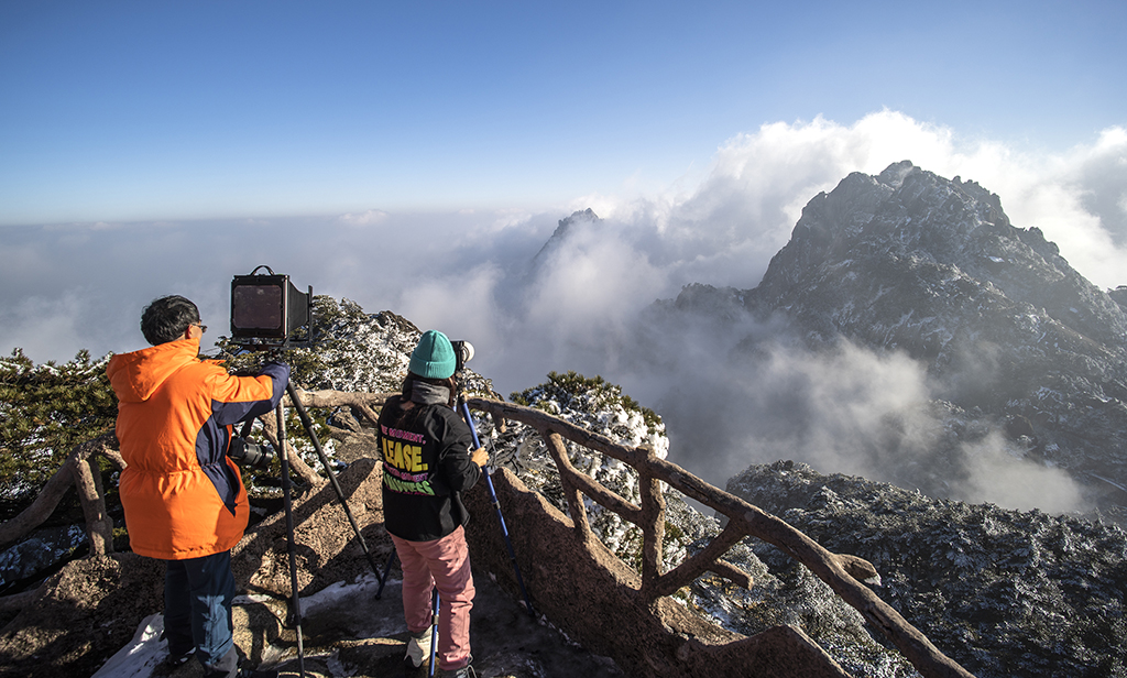 The snow-covered Mount Huangshan in East China’s Anhui province with cotton-looking clouds hovering above it. [Photo/IC]
