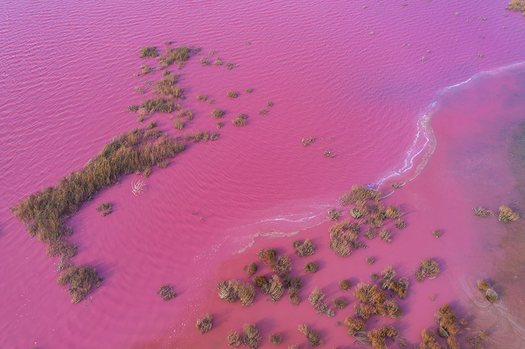 Ever seen a pink lake? A salt lake in Yuncheng, North China’s Shanxi province has turned pink. It’s no mystery. Under certain conditions, a kind of halophilic green microalgae called dunaliella salina produces heme that changes the color of the lake to pink. Cool!