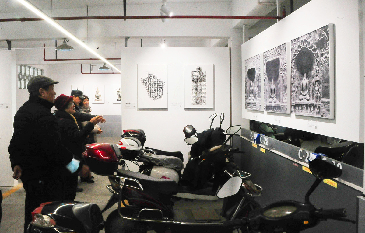 Residents view the Longmen Grottoes photo exhibit at the Dongchang new village in Pudong New Area, Shanghai. [Photo/VCG]