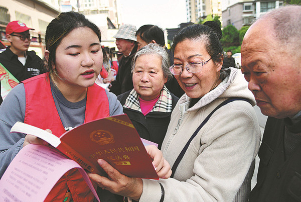 Volunteers discuss the Civil Code with residents of Zhenjiang, Jiangsu province, in April. SHI YUCHENG/FOR CHINA DAILY
