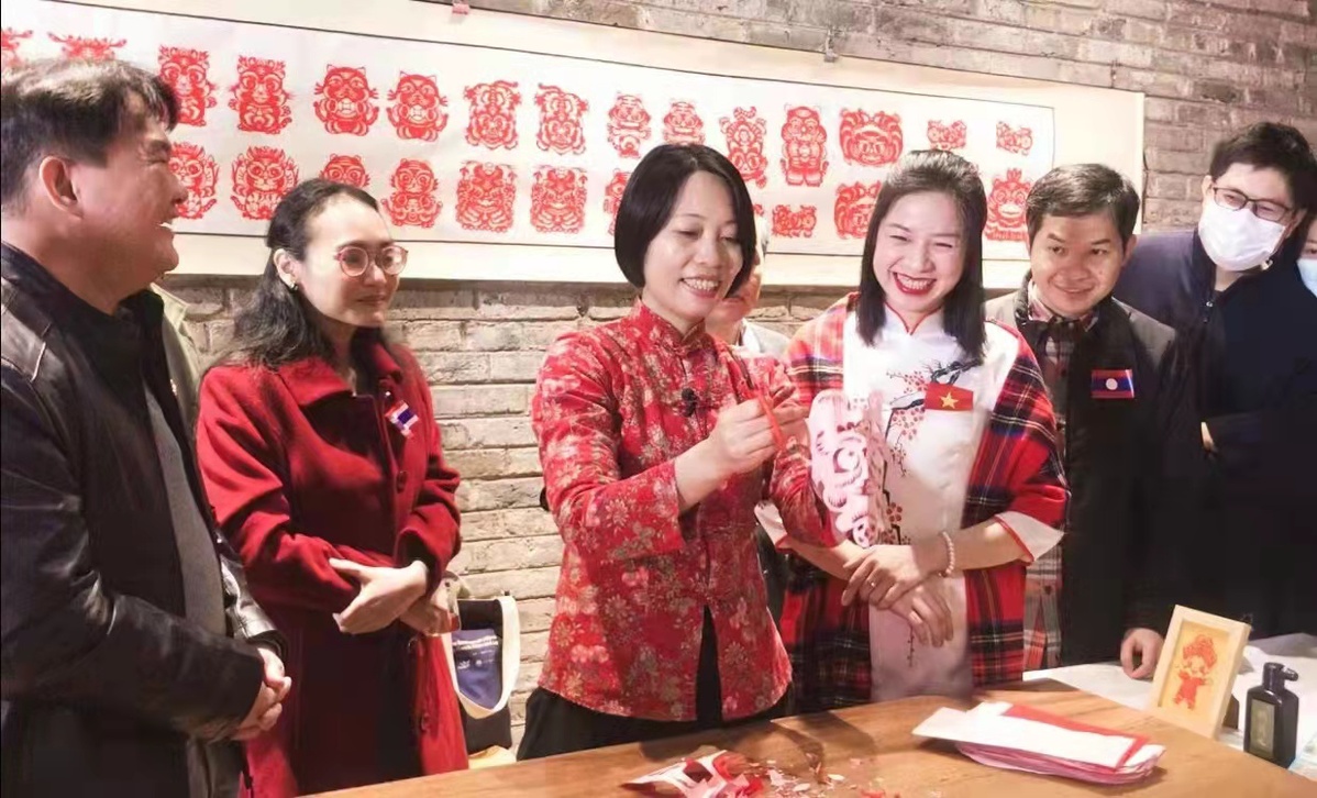 Foreign experts get a hands-on experience on paper-cutting at Guangxi International Paper Arts Center in Nanning, capital of the South China's Guangxi Zhuang autonomous region, on Sunday. [Photo provided to chinadaily.com.cn]