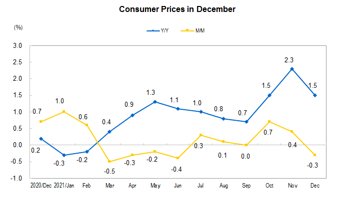 In December 2021, the national Consumer Price Index (CPI) rose by 1.5 percent year on year. Among them, the prices in urban and rural areas rose by 1.6 and 1.2 percent; the prices of food prices fell by 1.2 percent, and non-food prices rose by 2.1 percent; both the prices of consumer goods and service rose by 1.5 percent.