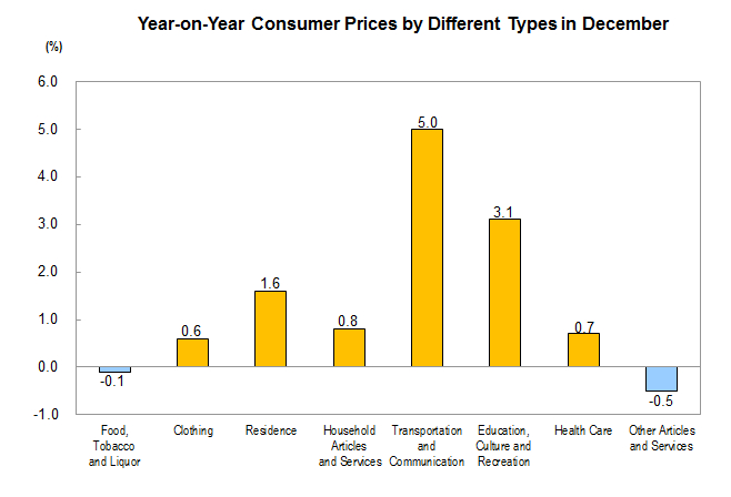 In December, the national consumer price fell by 0.3 percent month on month. Among them, the decline was 0.3 percent in urban areas and 0.3 percent in rural areas; food prices fell by 0.6 percent, and non-food prices fell by 0.2 percent; consumer goods prices fell by 0.4 percent and service prices were flat.