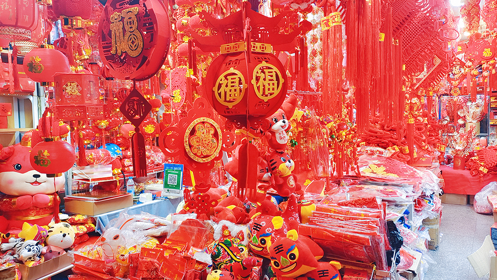 Today marks Chinese New Year’s Eve! On this day, people are busy decorating their homes. In the Yuyuan Garden in Shanghai, tiger-themed stuff toys, red lanterns, paper-cuttings, the Chinese character fu meaning “good luck”, and spring festival couplets are for sale.