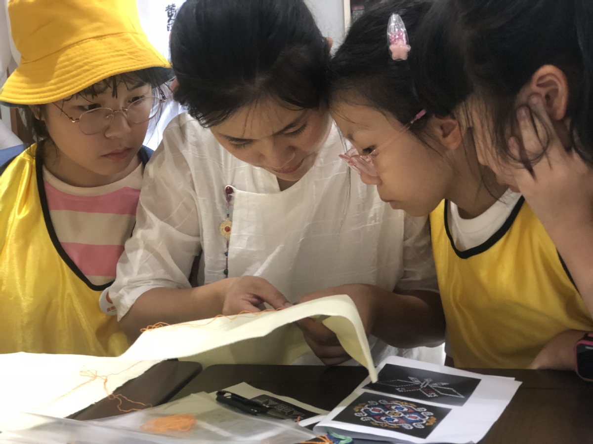 Hong Li introduces basic stitching skills to children at her workshop in Huangmei, Hubei province, in June. CHINA DAILY