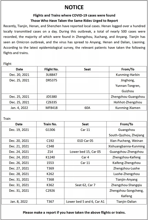 Positive COVID-19 cases were found on the following flights and trains. Please make a report if you have taken any of these rides.