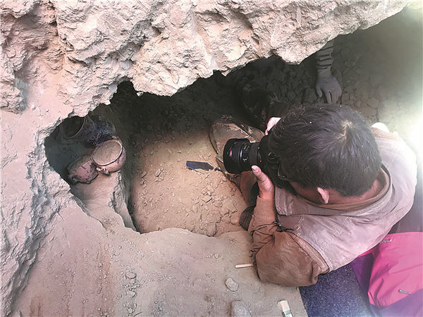 Shargan Wangdue, deputy director of the cultural relics conservation institute, photographs items unearthed at the Gadpaserul site in Ngari. [Photo provided to China Daily]