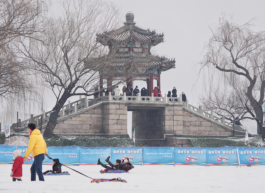 Parents and their children enjoy a snow activity at the Summer Palace in Beijing. [Photo/IC]