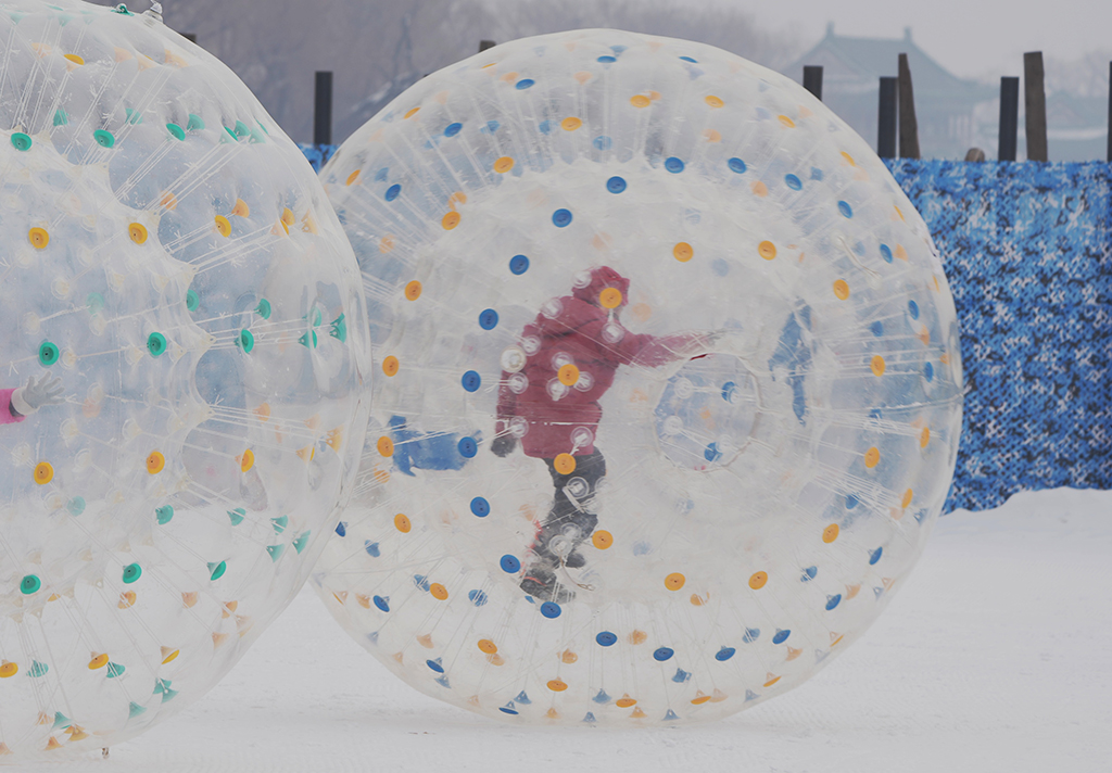 Tourists have fun in a wubble bubble ball in the snow at the Summer Palace in Beijing. [Photo/IC]