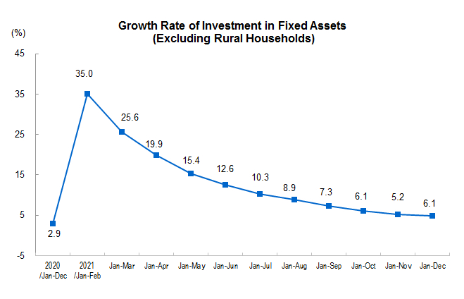From January to December 2021, the national fixed asset investment (excluding rural households) was 54,454.7 billion yuan, an increase of 4.9 percent over the previous year; it was 8.0 percent higher than that from January to December 2019, with an average growth of 3.9 percent in the two years. Among them, private fixed asset investment was 30,765.9 billion yuan, an increase of 7.0 percent over the previous year. On a month-on-month basis, investment in fixed assets (excluding rural households) increased by 0.22 percent in December.