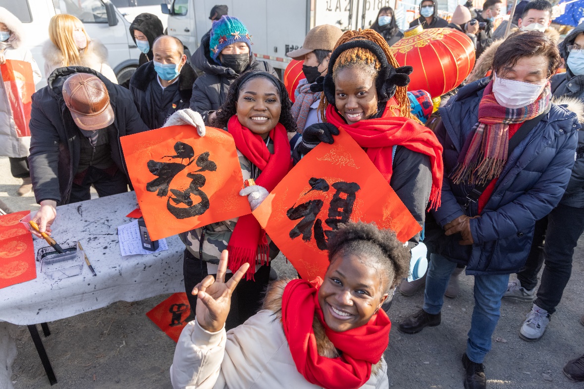 Foreigners hold the Chinese characters "Fu" meaning fortune. [Photo by Chen Song/Provided to chinadaily.com.cn]