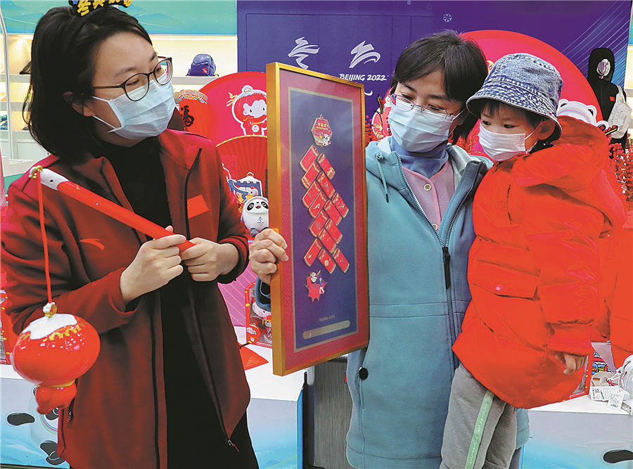 In the official flagship store on Wangfujing Pedestrian Street, customers purchase the "Igniting Winter Olympics" badges. [Photo by Jiang Dong/China Daily]
