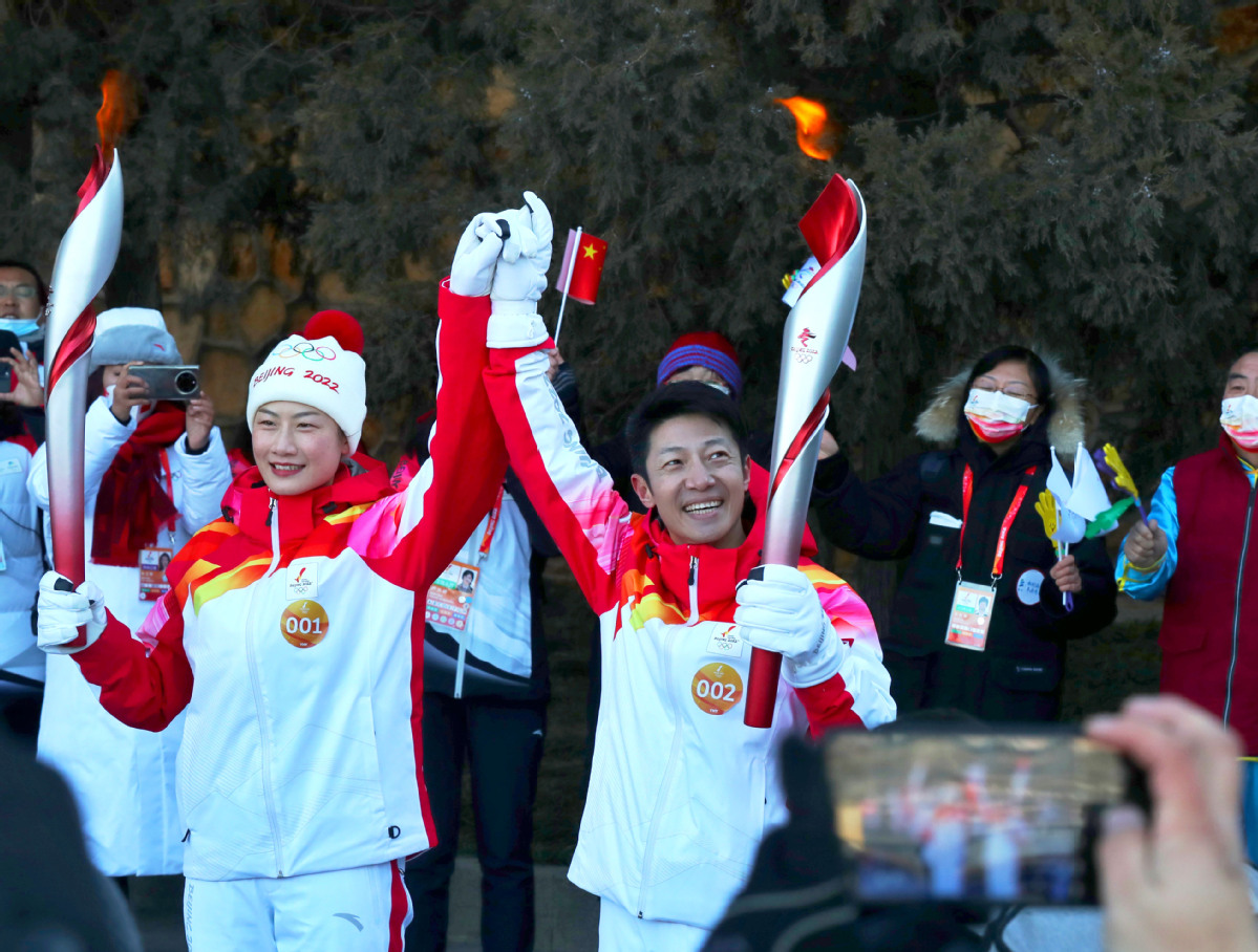 Torchbearer Ding Ning (left) and Sa Beining pass the torch on Feb 4, 2022. [Photo by Jiang Dong/for chinadaily.com.cn]
