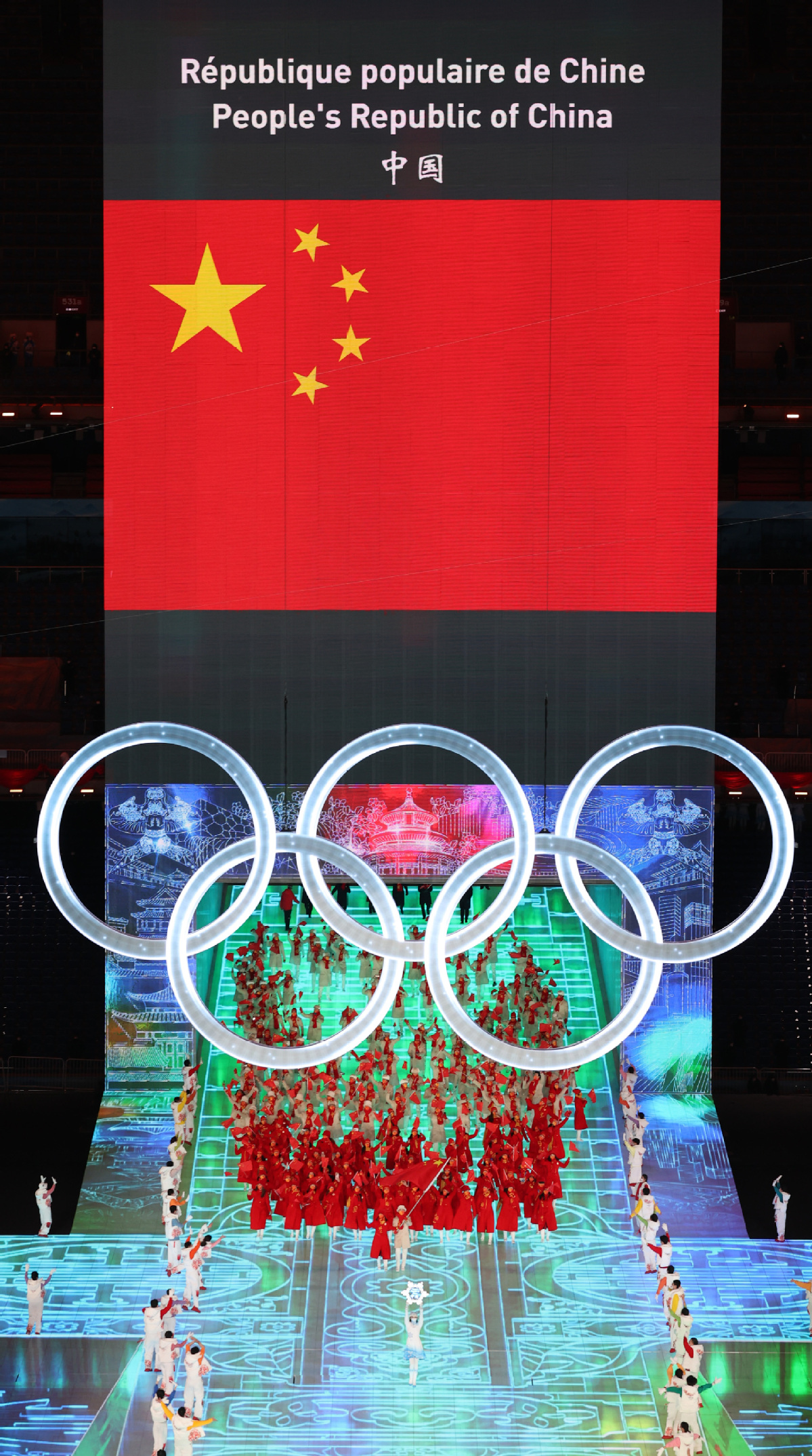 The Chinese Olympic delegation entered the opening ceremony with skeleton athlete Zhao Dan and speedskater Gao Tingyu as the flagbearers for the host nation.