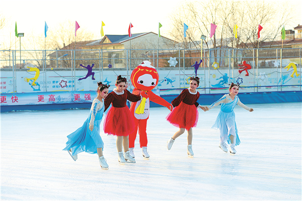 Together with a mascot of the Beijing 2022 Winter Paralympic Games, students of Taipingzhuang Center Primary School showcase their skating skills on a rink at the school in Beijing in January. [Photo by Li Yan/For China Daily]