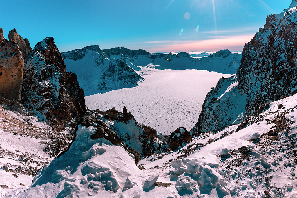 Tianchi Lake is surrounded by the snow-covered Changbai Mountains in Northeast China’s Jilin province. [Photo/IC]