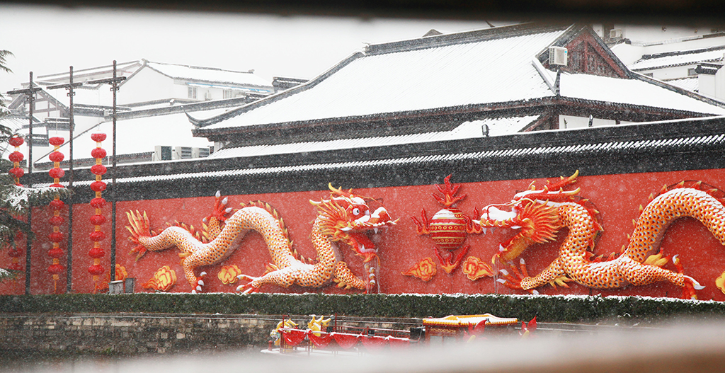 The Great Spirit Screen decorated with dragons is covered by snow in the Confucius Temple scenic area in Nanjing, East China’s Jiangsu province. [Photo/IC]