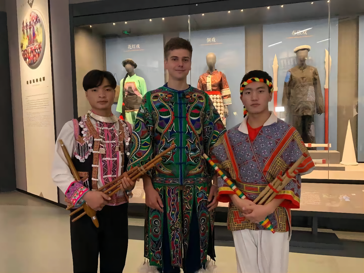 German vlogger Robert Adolf tries on Chinese ethnic garb at a culture exchange event in Guizhou University in Guiyang, Southwest China's Guizhou province, on Dec 15, 2021. [Photo provided to chinadaily.com.cn]
