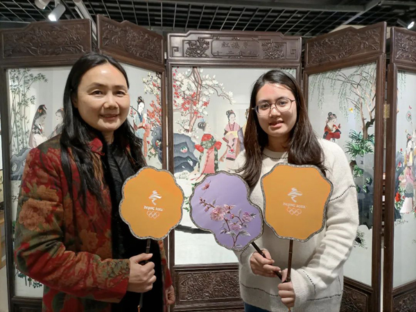Artist Lu Meihong and her daughter Yu Zhujun have designed three kinds of fans featuring double-sided embroidery, with one side showing the emblem of the Beijing 2022 Winter Olympic Games and the other side featuring classical bird-and-flower paintings.