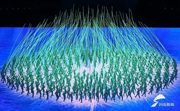 Martial arts students from Laizhou create a giant image of green grass during the opening ceremony at the 2022 Beijing Winter Olympics. [Photo/Iqilu News]