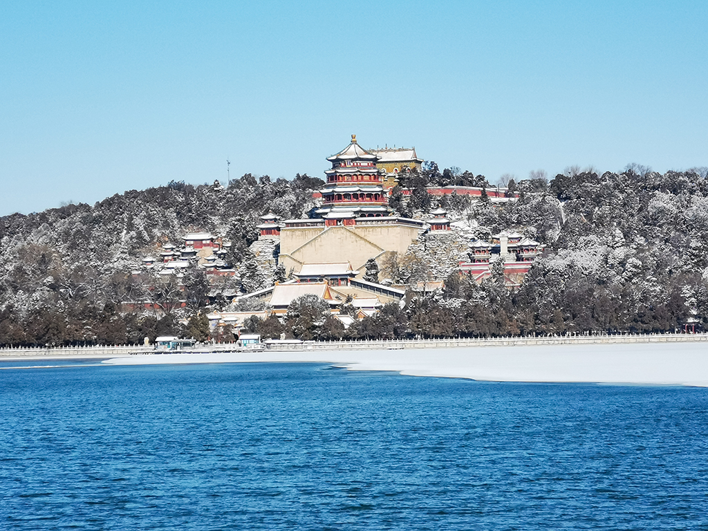 The Pavilion of the Fragrance of Buddha (Foxiang’ge) is covered by snow in the Summer Palace. [Photo/IC]