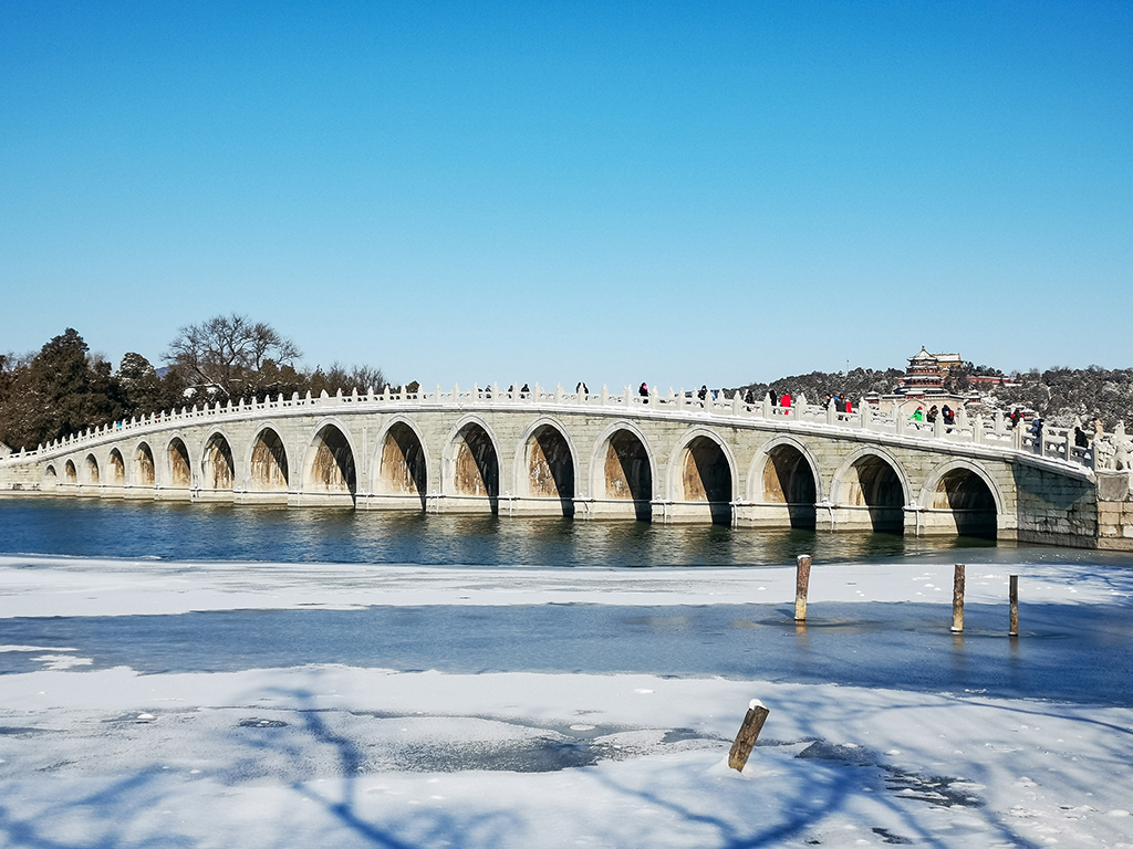 The snowy view of the Seventeen-Arch Bridge in the Summer Palace. [Photo/IC]