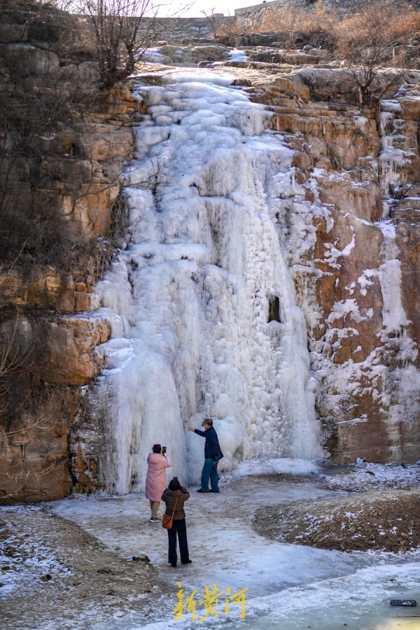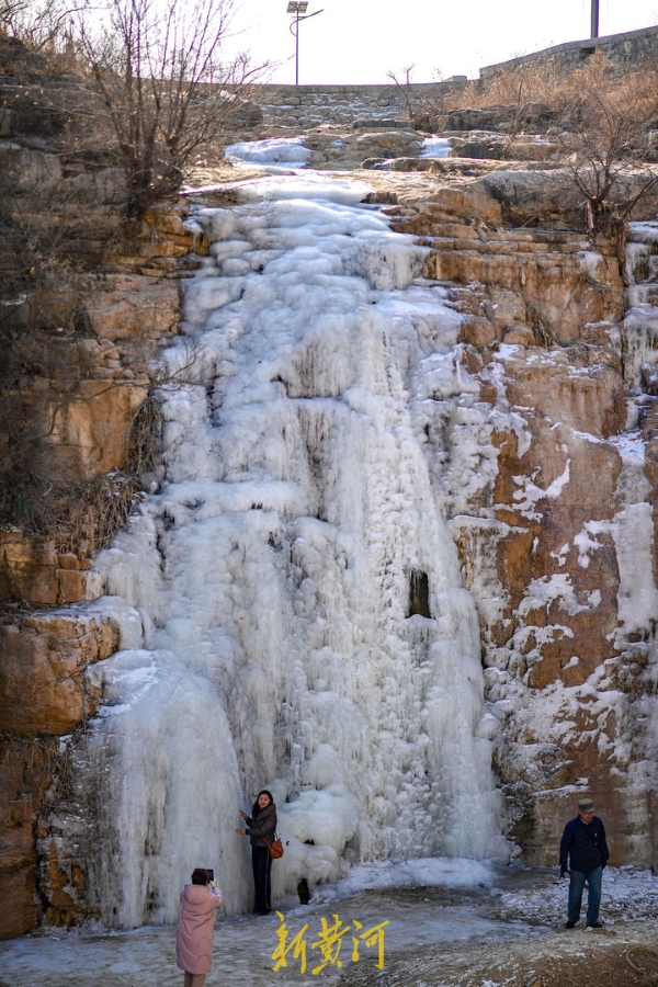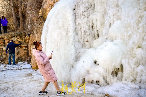 Visitors take photos of the frozen waterfall in Foyugou. The frozen waterfall is due to increasingly low temperatures in Jinan. [Photo/aijinan.com.cn]