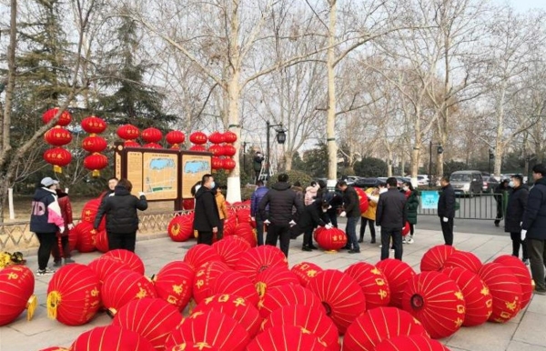 A team of workers prepare to decorate the World's Best Spring Scenic Area with red lanterns. [Photo/dzwww.com]