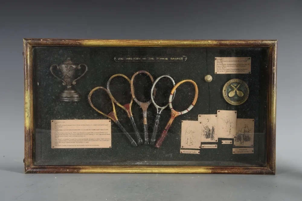 Models showing the evolution of the tennis racket between 1912 and 1949, collection of the Hainan Museum [Photo/Official WeChat account of the Hainan Museum]