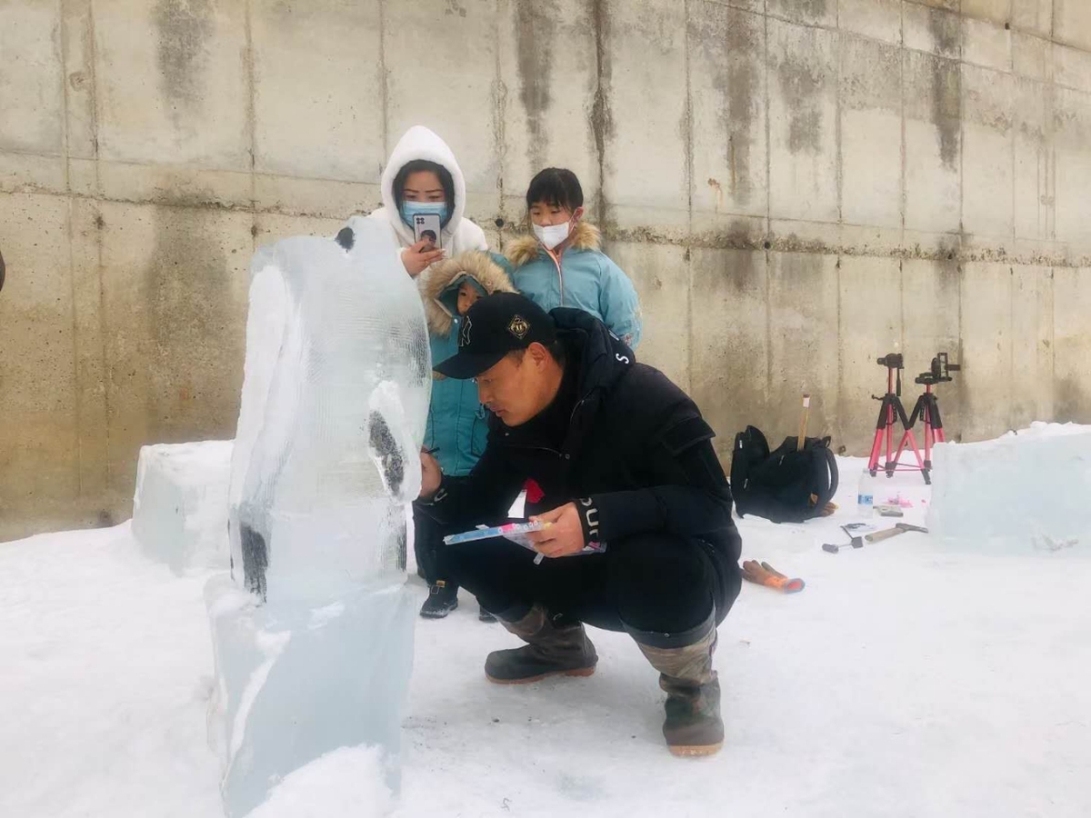 A man from Jilin province uses ice to carve Bing Dwen Dwen, the mascot for the Beijing 2022 Olympic Winter Games. [Photo provided to www.chinaservicesinfo.com]