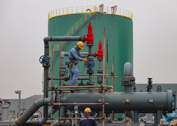 Workers install shale gas storage facilities in Guizhou's Zheng'an county. [Photo/Guizhou Daily]