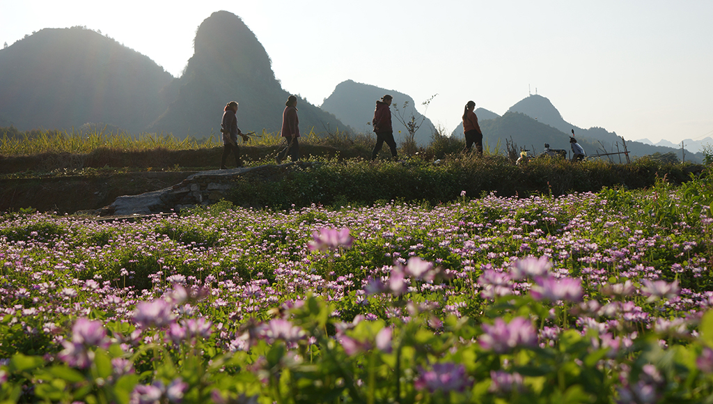 Blooming Chinese milk vetch flowers grow at the foot of the mountains in Banhe village, Laibin, Guangxi Zhuang autonomous region. [Photo/IC]