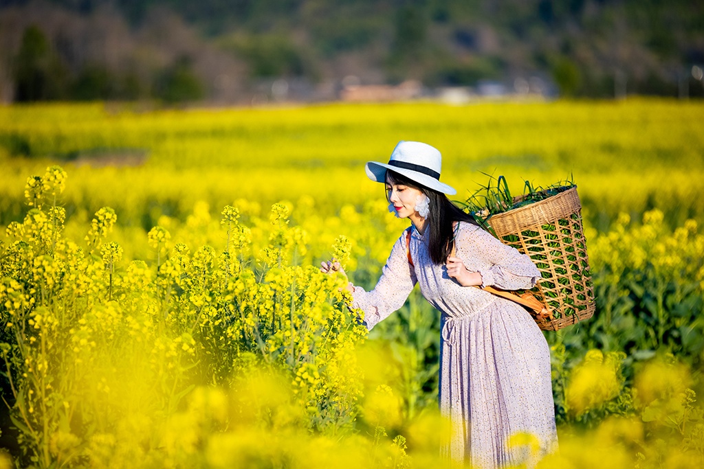 A woman picks golden rapeseed flowers in Jietou town, Tengchong, Southwest China’s Yunnan province. [Photo by Xu Jun/provided to www.chinaservicesinfo.com]
