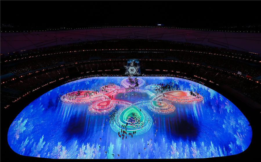 The 12 Chinese zodiac-themed ice cars created an outline of a Chinese knot with its wheel trails. And then it was enlarged, and an enormous "Chinese knot" was presented using digital AR technology. Each ribbon could be clearly seen, and all of the ribbons intertwined together, symbolizing unity and auspiciousness.